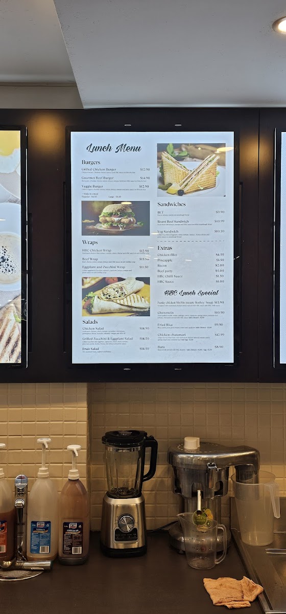 For lunch, the menu provides several prepared dishes including the HBC Lunch Special—a Funky Chicken Momo wrapped with marinated chicken mince accompanied by house sauces. Other main dishes include Chow Mein made with thin noodles, assorted vegetables, and chickpeas, as well as Fried Rice prepared with Basmati rice and mixed seasonal vegetables.